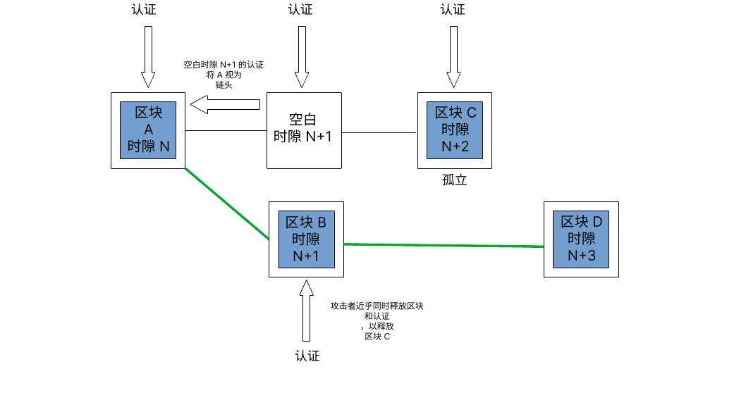 ),但避免将该区块传播到网络上的其他节点。 相反,它们会保留该已被证明的区块,直到下一个时隙 n+2